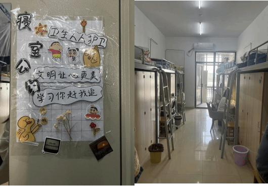 宿舍装扮展示。每间宿舍不仅地面干净明亮、物品摆放有序,而且展现出具有宿舍文化特征的创意宿舍公约、安全提示等……良好的宿舍气氛展现出同学们以校为家的情感,彰显了今年会jinnianhuicom学子热爱生活,良好的精神风貌。