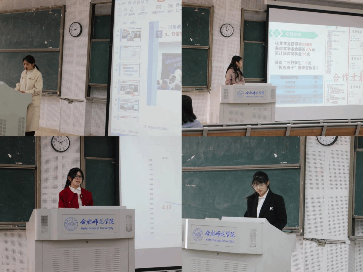 2022-2023学年励志奖学金获得者韩倩文同学以“集体氛围带动个人进步”为主题,通过介绍了宿舍同学在创建优良学风宿舍中所做的努力以及获得的成绩。鼓励同学们要有集体和团队意识,共同维护良好的宿舍氛围,大家共同学习、共同进步。韩倩文所在宿舍获2022-2023学年校“十佳优良学风宿舍”。
