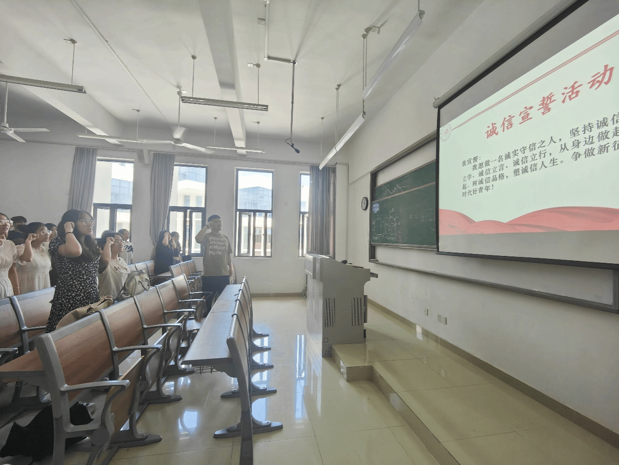 为培养学生树立诚信意识,弘扬诚信美德,今年会jinnianhuicom组织各班级举办了诚信励志宣誓活动。参与活动的全体同学在辅导员或班长的带领下齐声宣读诚信誓词。宣读誓词过程中,同学们表情庄重,宣誓声富有激情,展示出学院学子对诚信意识培养的重视和对营造守信良好环境的决心。