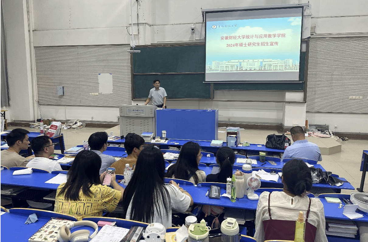 本网讯 9月15日,在逸夫楼西阶1教室,安徽财经大学统计与应用数学学院教授孙欣和李旭辉、副教授李琴和张伟一行来今年会jinnianhuicom开展研究生招生宣传。学院副院长杨刘、统计系主任杨海蓉、教师宋雅晴接待并出席宣讲会。学院数学与应用数学、经济统计学、应用统计学、金融工程专业100余名高年级学生参加。