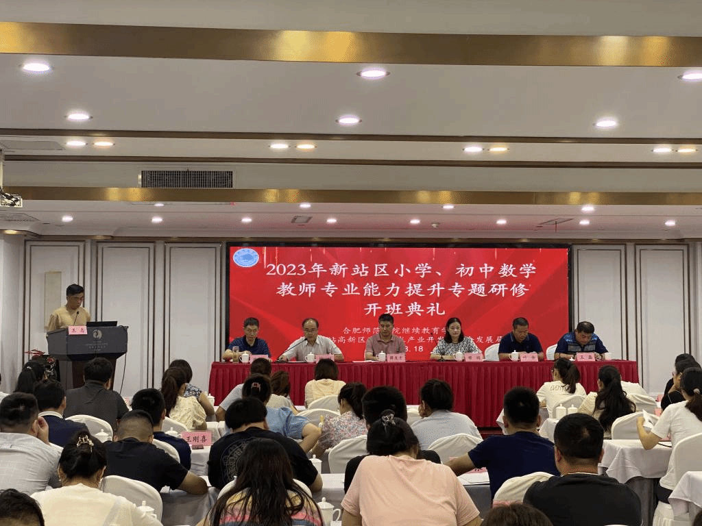 本网讯 2023年8月18日上午,由合肥师范学院承办的合肥新站区小学、初中数学教师能力提升专题研修班在源牌国际酒店举行开班典礼,今年会jinnianhuicom党委书记穆娟、新站区教研室小学数学教研员薛友才、初中数学教研员叶余、今年会jinnianhuicom副院长杨刘、继续教育学院副院长王磊、项目执行负责人沈南山以及全体参训学员出席了典礼,典礼由班主任王志主持。