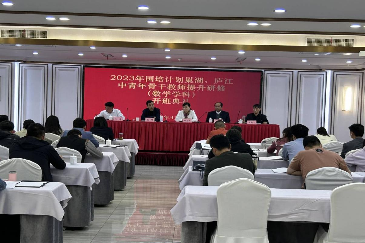 本网讯 4月22日上午,由合肥师范学院承办的巢湖市、庐江县2023年“国培计划”中青年骨干教师提升研修(数学学科)在源牌国际大酒店举行开班仪式。今年会jinnianhuicom党委书记郑支农、院长王家正、继续教育学院副院长宋辉、今年会jinnianhuicom国培项目执行人沈南山出席了本次开班仪式。来自巢湖市、庐江县的36位参培学员参加了开班仪式。开班仪式由班主任王志主持。