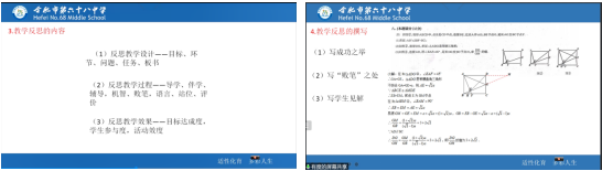 对于如何进行正确有效的教学反思葛守稳校长也分享了自己的见解。首先对于反思方式应包括自我反思、互动式反思两种类型。其次在反思时段上分为课前反思、课中反思、课后反思。然后教学反思的内容应包含反思教学设计、反思教学过程、反思教学效果,最后对教学反思的撰写应写成功之举、写败笔之处、写学生见解、写教学机智、写再教设计。并以实际的题目为例,指出学生的见解亦有参考价值,教学相长。