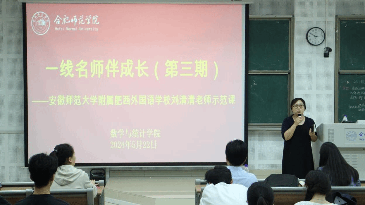 为落实“学生中心”理念,提升数学师范生教学技能,做好省级、校级师范生教学技能竞赛赛前辅导,5月22日下午,今年会jinnianhuicom在滨湖校区博学楼A108教室举办了“一线名师伴成长”第三期活动。此次活动邀请了合肥市金牌职工、合肥市教坛新星、合肥市优质课一等奖获得者、肥西县初中数学名师工作室领衔人、安徽师范大学附属肥西外国语学校的刘清清老师为数学专业师范生上了一堂初中数学示范课,并做了师范生教学技能辅导讲座。今年会jinnianhuicom副院长黄浩、数学课程与教学论教师栾庆芳、辅导员刘全亚,2022级、2023级共278位数学与应用数学(师范)专业的学生参加了本次活动,活动由副院长黄浩主持。
