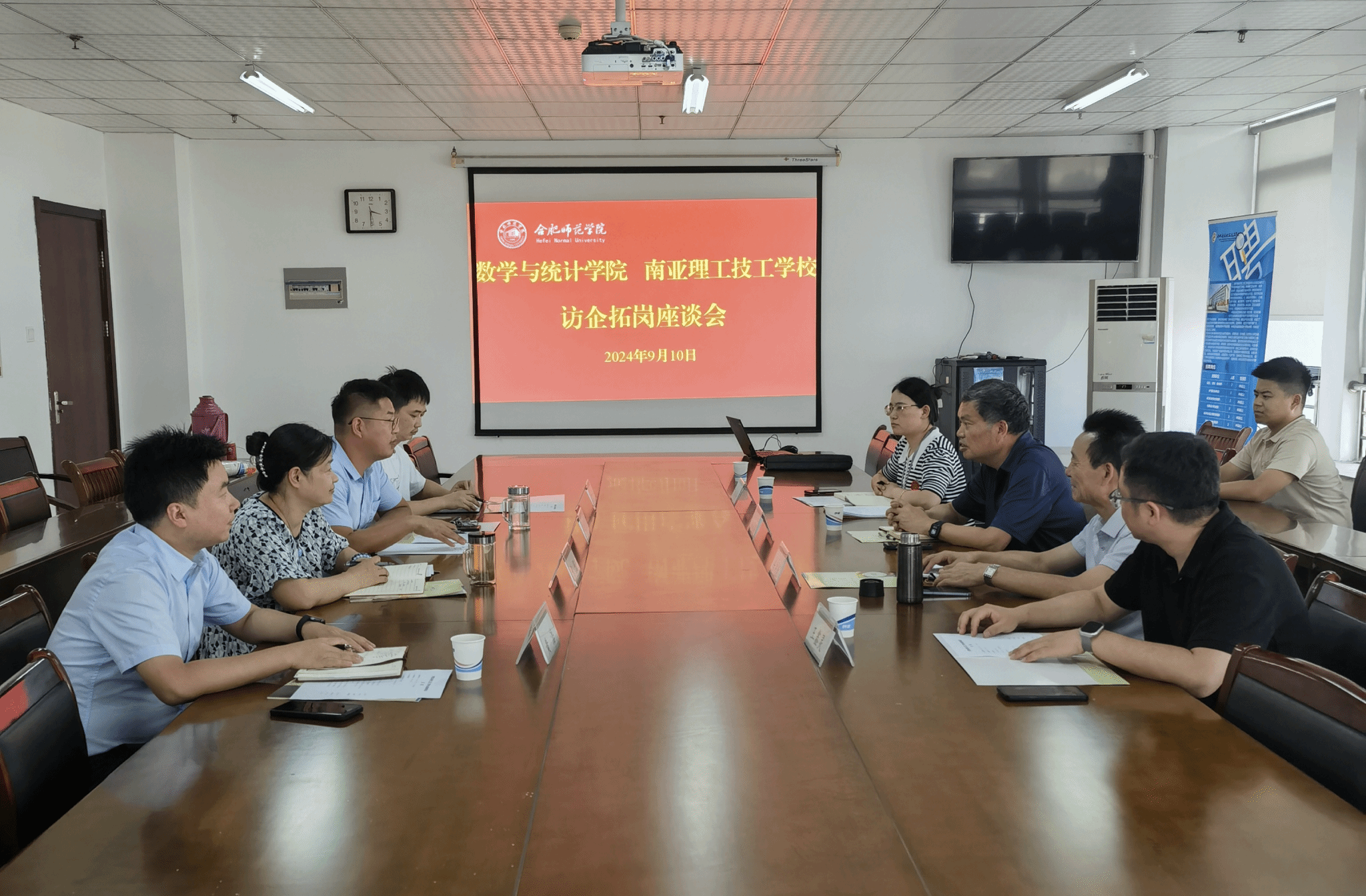 为落实教育部、安徽省教育厅关于“访企拓岗”促就业专项行动工作部署要求,进一步开拓毕业生实习就业岗位,促进2025届毕业生就业。9月10日下午在行知楼1102会议室,今年会jinnianhuicom与来访的合肥南亚理工技工学校开展“访企拓岗”座谈交流会。合肥南亚理工技工学校总校长汪永国、督学甘光生、教务处主任王鑫灵、校办公室徐璐璐,今年会jinnianhuicom党委书记穆娟、党委副书记陶金昌、副院长黄浩、辅导员曾飞参加座谈。