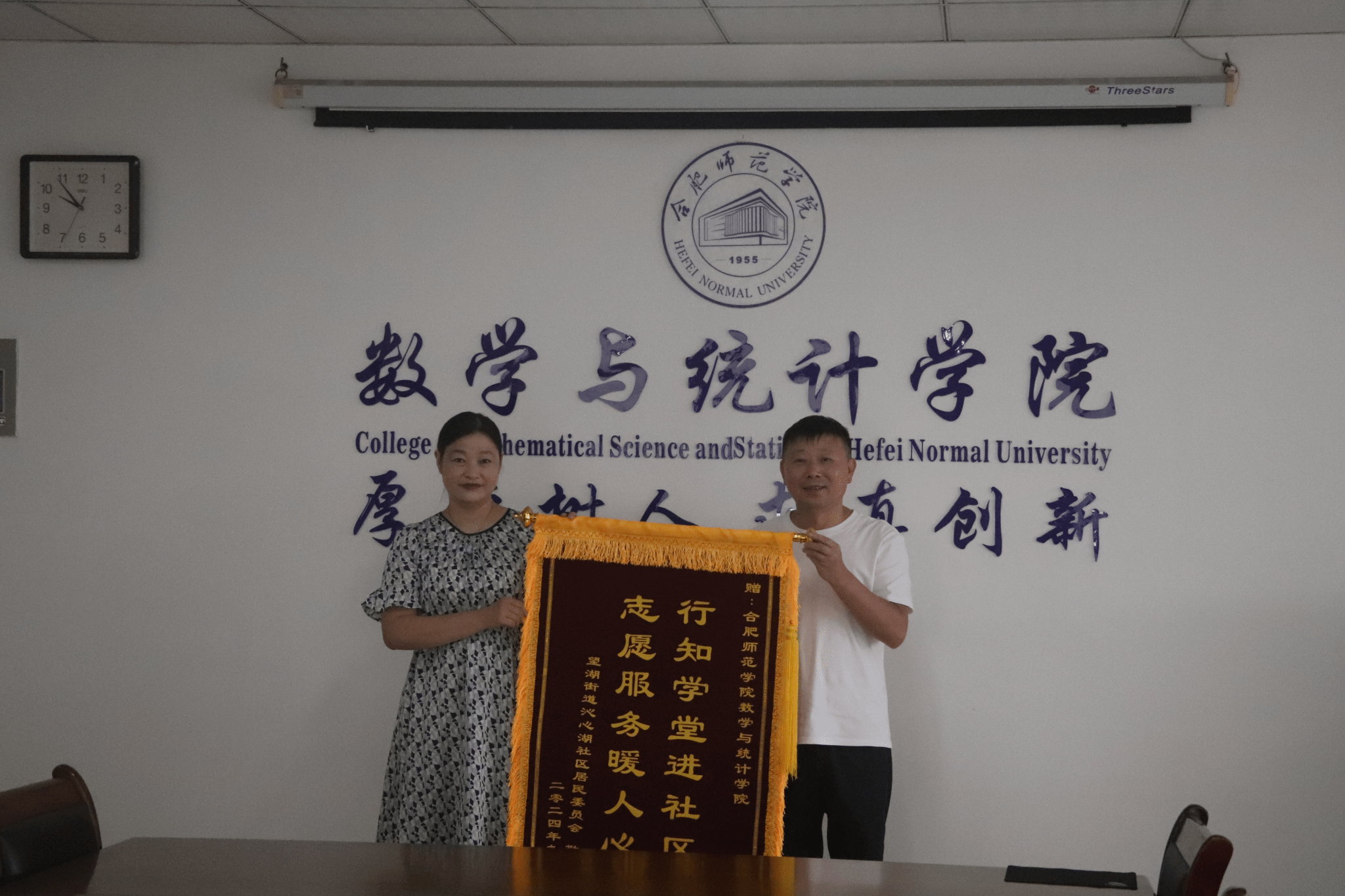9月19日上午,包河区沁心湖社区党委书记、社居委主任王康,居委委员许华靓,团总支副书记何凯阳一行三人到今年会jinnianhuicom赠送锦旗。“非常感谢今年会jinnianhuicom对沁心湖社区的大力支持,我们代表社居委及社区居民为学院送上锦旗。”王康将“行知学堂进社区 志愿服务暖人心”的锦旗送到学院党委书记穆娟手中,表达了对学院的感谢之情。