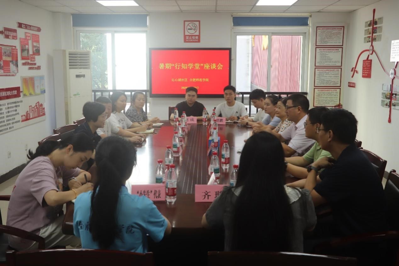 座谈会上,周端明首先代表学校向沁心湖社区对“行知学堂”的支持表示衷心感谢。他表示沁心湖行知学堂自2018年创办以来,累计服务社区儿童约200人次,得到了社区的鼎力支持。随后,他介绍了学校立足地方经济社会发展,坚持服务社会的办学情况,并着重介绍了“行知学堂”作为学校共青团重点培育的实践育人品牌,十三年来始终践行陶行知先生“生活即教育”的理念,在安徽省16个地市实现全覆盖,并辐射全国15个省市自治区,累计为数万名留守儿童点亮求知明灯。2022年荣获了共青团中央颁发的"中国青年志愿者优秀项目奖",这也是对学校"小先生制"实践模式的最大肯定。最后,他对"小先生"们提出三点期望:一要筑牢安全防线,将小学员的人身安全置于首位,保障好自身安全;二要创新课程体系,结合服务对象和驻地特点,设计兼具趣味性和实用性的特色课程,提升“小学员”的兴趣,培养个性化能力和创新精神;三要深化红色育人,充分发挥党员示范学堂的引领作用,将党史学习教育与社区党建文化有机融合,培育新时代少年的家国情怀。周端明表示,行知学堂“小先生”们参与学堂活动,不仅是对陶行知“教学做合一”教育理念的践行,更是服务社会的生动实践。希望“小先生”们践行“爱满天下,知行合一”的校训精神,用专业所学为青少年儿童成长赋能。