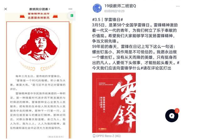 此次活动包括线上系列宣传、义务植树和校园环境改善等。3月5日为雷锋纪念日,学院通过数统学院微信公众号、班级QQ群等平台讲述雷锋故事,发现身边雷锋好人,增强了同学们文明修身的服务意识和奉献意识。