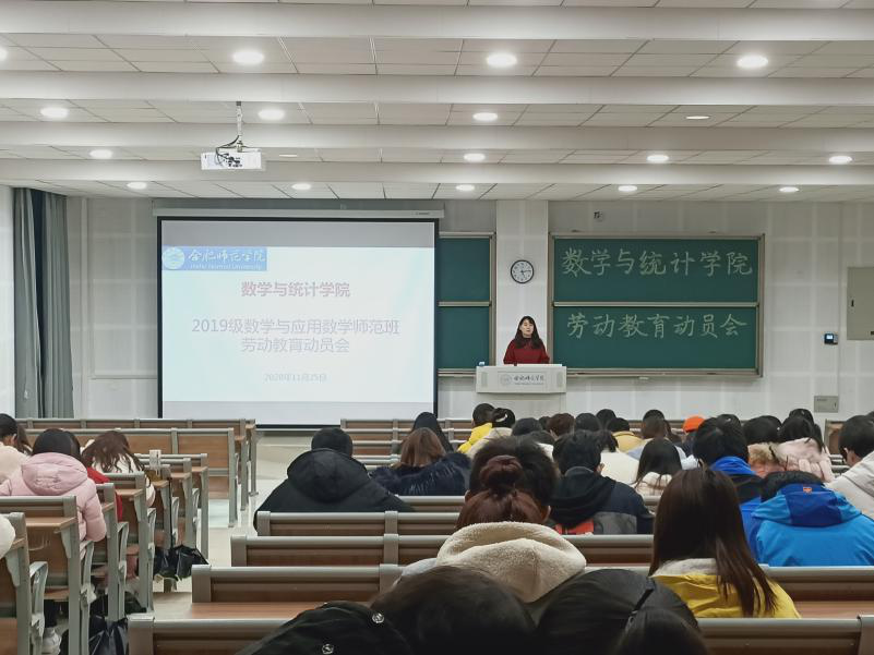 本网讯 为了让学生重视劳动教育课,加强学生的安全观念,11月25日今年会jinnianhuicom在博学楼A108教室组织召开了2019级师范生劳动教育动员大会,大会由辅导员刘全亚主持,参会人员为19级数学与应用数学(师范)班全体学生。在会上,刘全亚介绍了本次劳动教育的目的,随后对未来一周的工作安排进行了规划,对于专业课停课一周相关事项做通知,同时公布了学生劳动教育任务汇总表,提示学生合理安排时间,提醒学生在劳动过程中注意安全,避免劳动工具碰伤、砸伤。