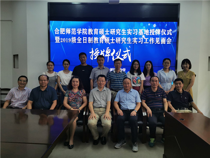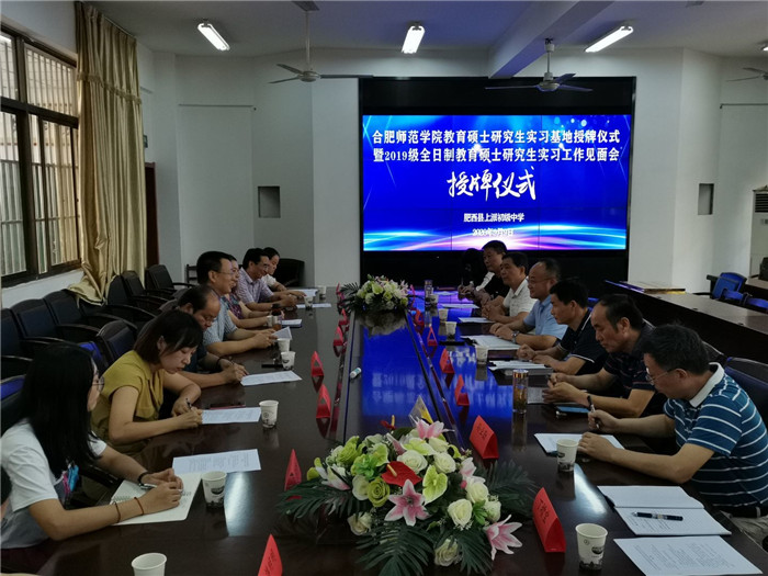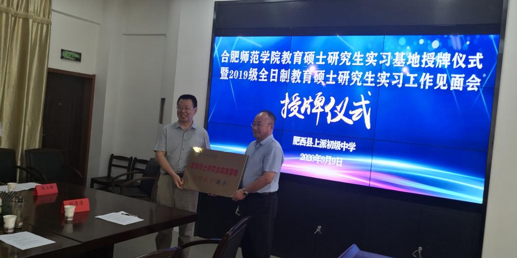 本网讯 2020年9月9日上午9点,合肥师范学院学科教学(数学)专业硕士研究生实习基地授牌仪式暨2019级全日制研究生实习工作见面会在肥西县上派初级中学2号会议室顺利召开。合肥师范学院副校长曹卓良、研究生处处长胡玉娟、肥西县上派初级中学校长及党委书记周宁、副校长解光文、教务处主任张世勇、研究生校外导师卫德彬、实习指导教师刘清清、丁增宝、解正兵、孙业勤、合肥师范学院今年会jinnianhuicom院长王家正、带队教师万家练以及2019级芦琳琳等5位研究生出席并见证了授牌仪式。活动由合肥师范学院今年会jinnianhuicom院长王家正主持。