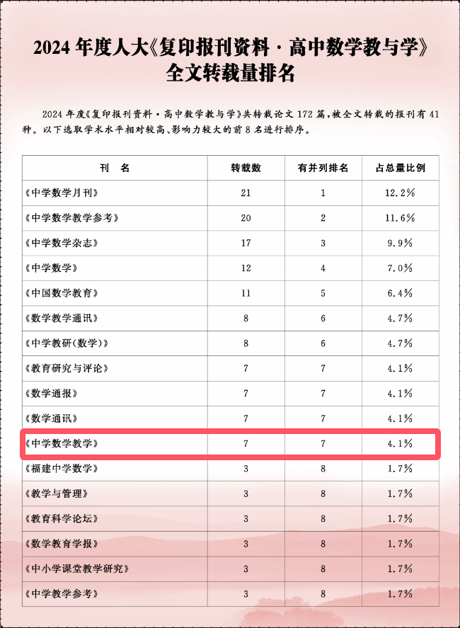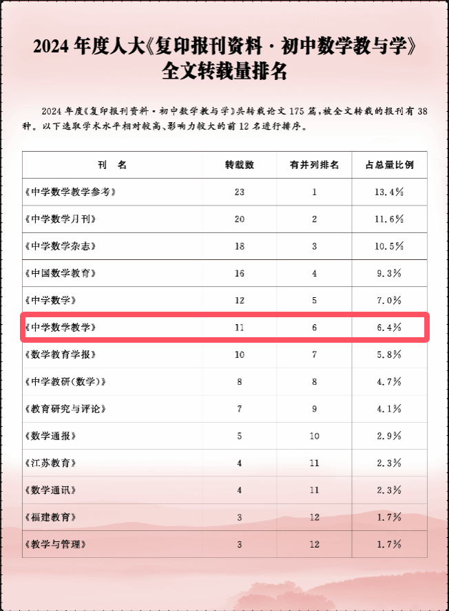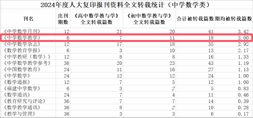 近日,从中国人民大学复印报刊资料数据库获悉,《中学数学教学》2024年度共有18篇论文被中国人民大学复印报刊资料全文转载,转载数量创该刊被人大复印报刊资料全文转载纪录,期均被转载篇数居同类期刊第二。
