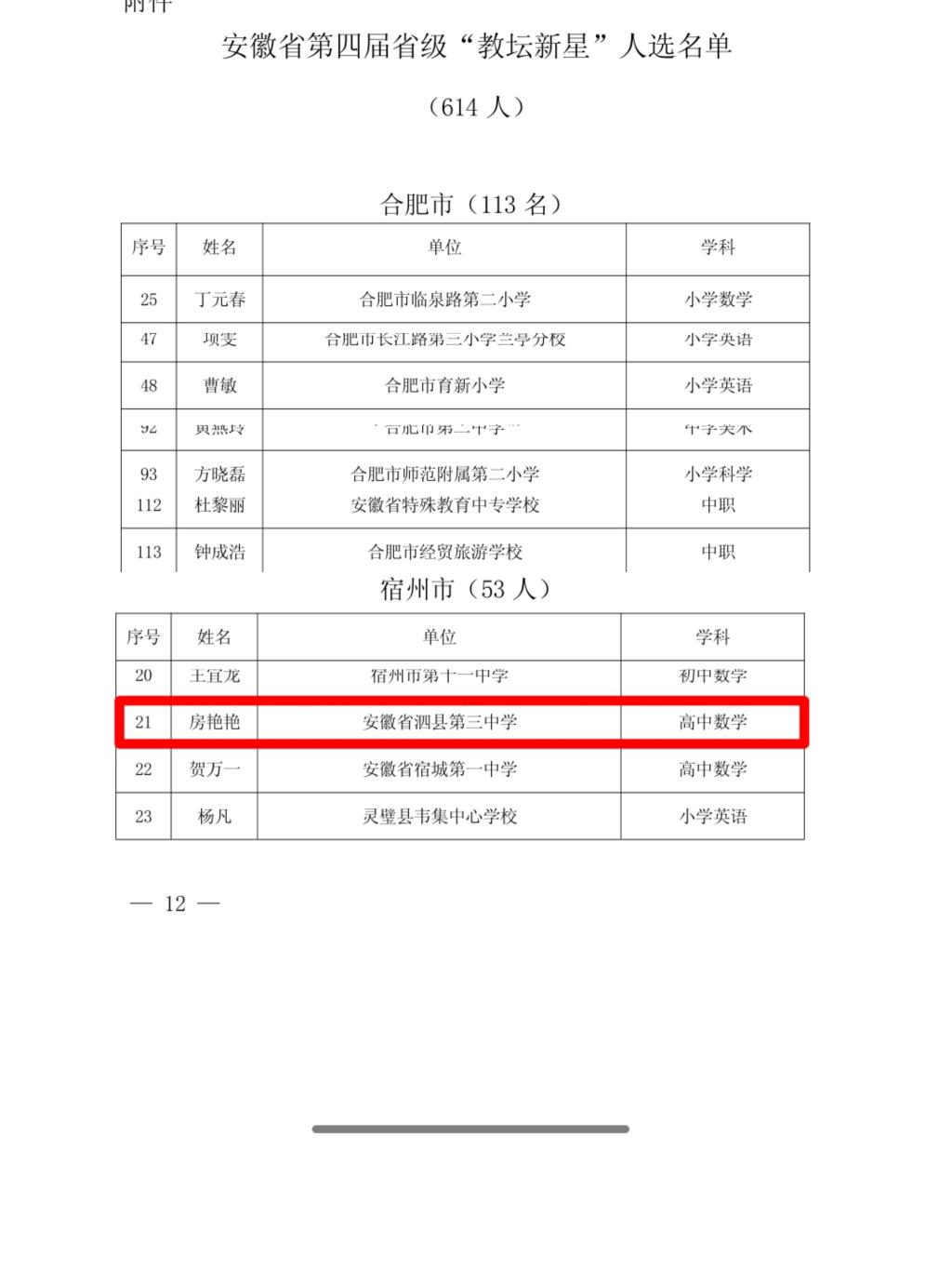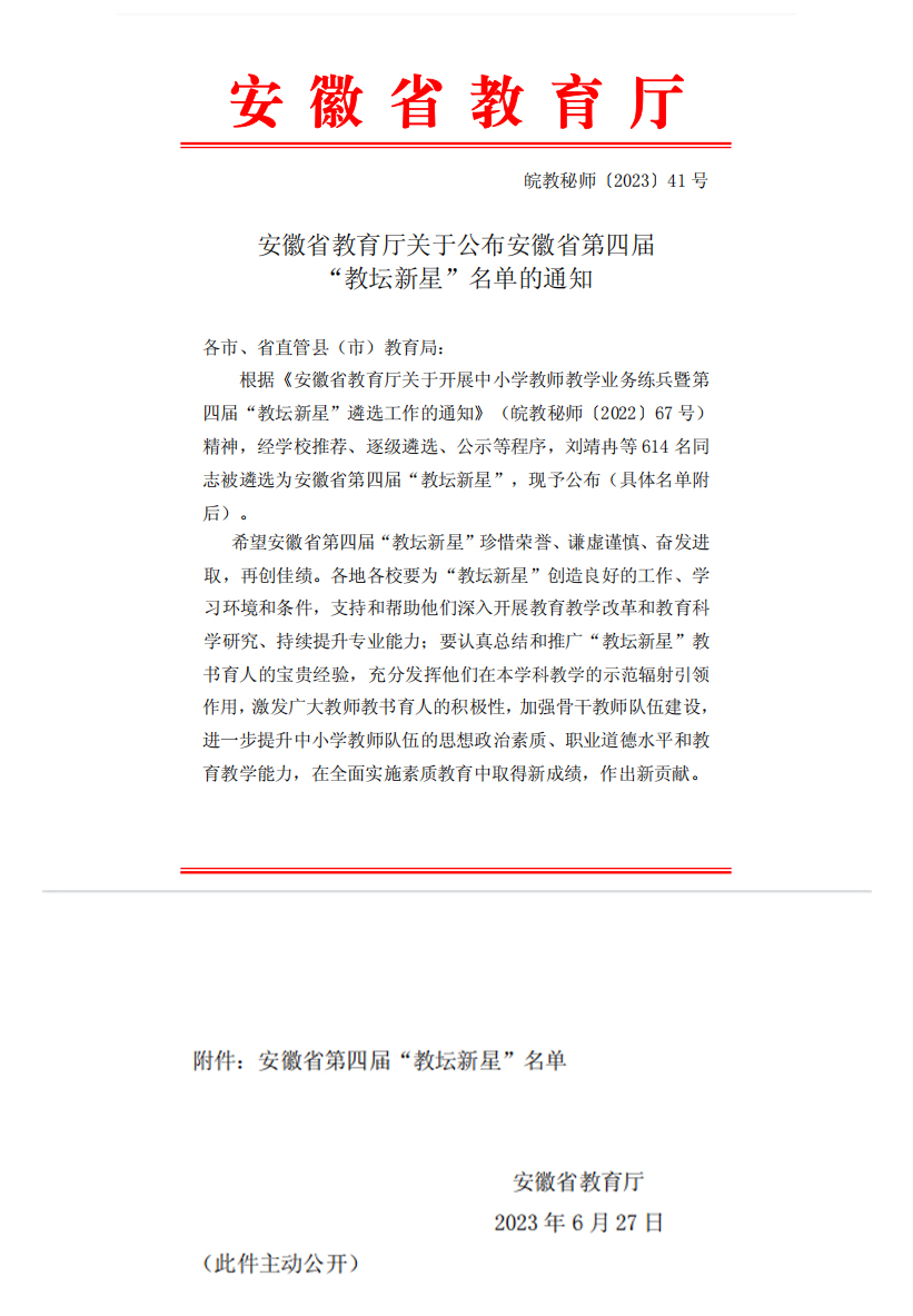 6月27日,安徽省教育厅发布文件《安徽省教育厅关于发布安徽省第四届“教坛新星”名星的通知》,公布了评选出的第四届省级教坛新星名单,我院2010届数学与应用数学专业校友、宿州市泗县三中教师房艳艳名列其中。