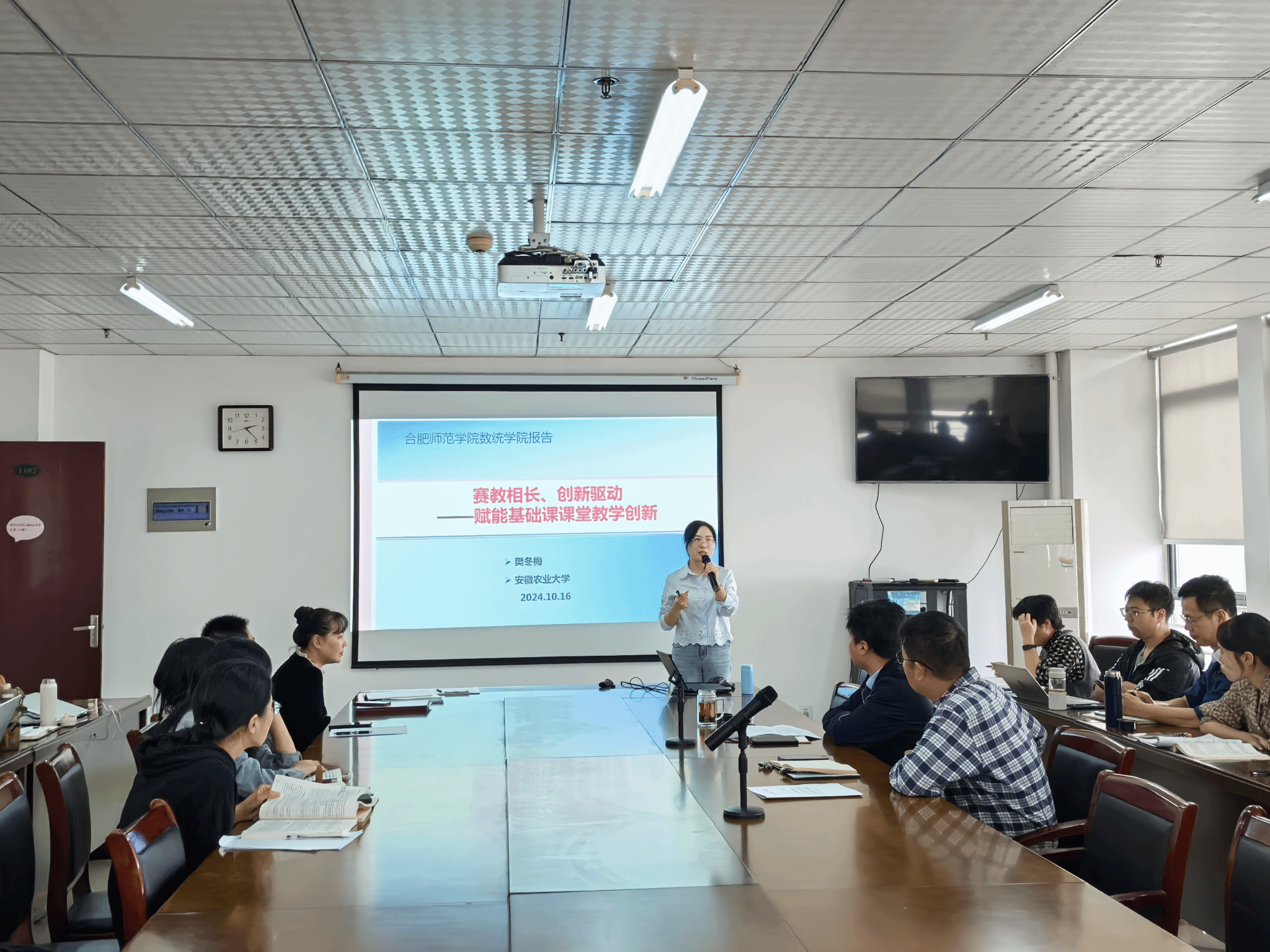 教师教学竞赛是推动教师专业成长、提升教学质量的重要途径。为进一步发挥教师教学竞赛的示范引领作用,提升教师教学能力,激发教师教学创新热情,10月16日下午,今年会jinnianhuicom在行知楼1102会议室开展了“行知路上大家谈”第十二期活动,邀请了安徽农业大学信息与人工智能学院副教授、第四届全国高校教师教学创新大赛二等奖获得者樊冬梅老师,为全体教职工开展以“赛教相长,创新驱动——赋能基础课课堂教学创新”为主题的专题报告,报告会由副院长黄浩主持。
