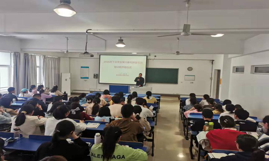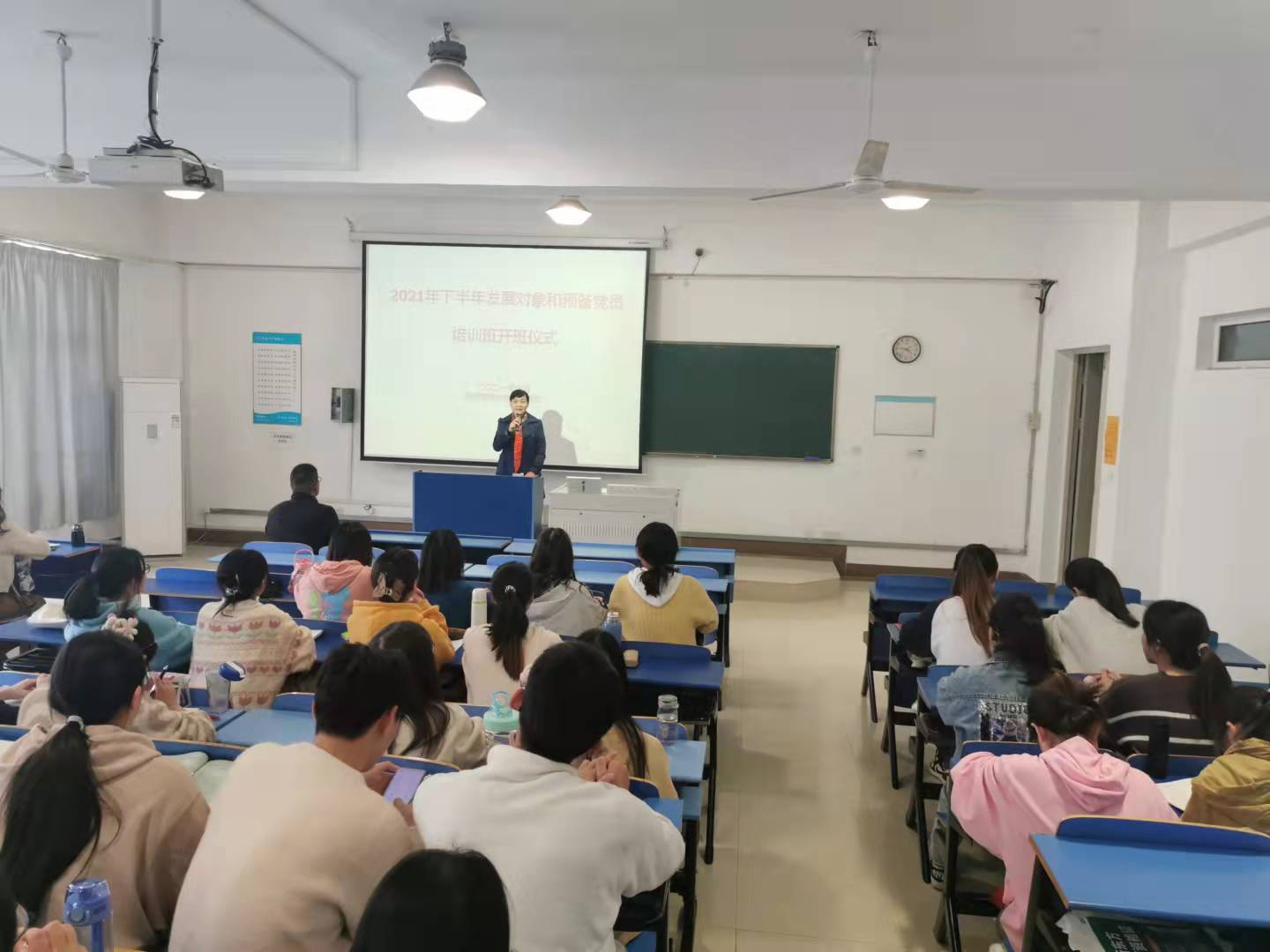 本网讯 2021年10月26日,今年会jinnianhuicom分党校2021年下半年发展对象与预备党员培训班在锦绣校区逸夫楼A406举行,今年会jinnianhuicom党委书记郑支农、党委副书记陶金昌,88名发展对象和预备党员参加了开班仪式,仪式由学生党支部书记杨尔飞主持。