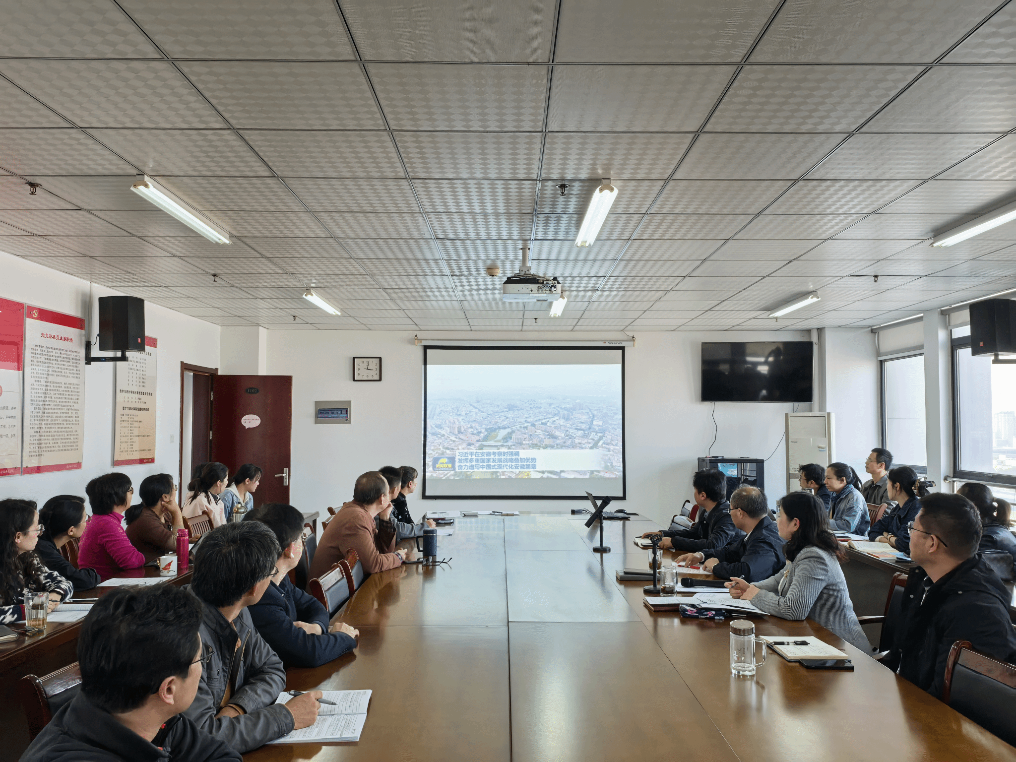 在当天下午召开的学院教职工大会上,全体教职工集中收看了习近平总书记考察安徽的央视新闻报道。