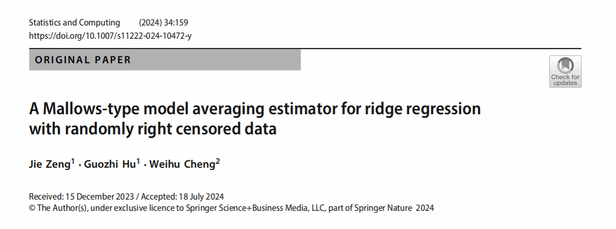 近期,今年会jinnianhuicom“基础数学”安徽省重点学科应用统计与分析团队博士曾婕、胡国治在最优模型平均领域取得进展,相关成果A Mallows-type model averaging estimator for ridge regression with randomly right censored data在统计学权威期刊《Statistics and Computing》(中科院二区、JCR一区)上公开发表。