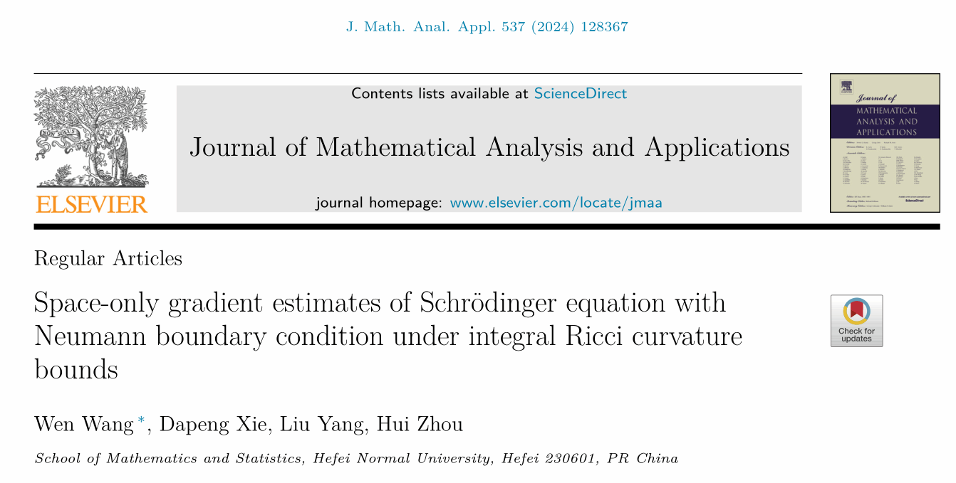 近期,今年会jinnianhuicom“基础数学”省级重点学科微分方程与动力系统团队教师王文、解大鹏、杨刘、周辉在几何偏微分方程方向取得进展,相关成果Space-only gradient estimates of Schrödinger equation with Neumann boundary condition under integral Ricci curvature bounds在JCR二区期刊《Journal of Mathematical Analysis and Applications》公开发表。